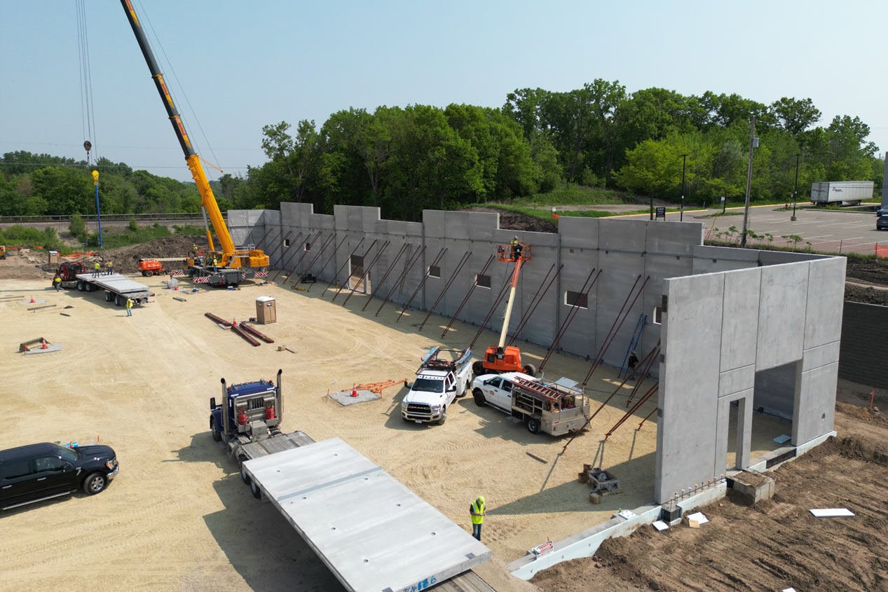 Precast walls require much less staging space than other concrete wall systems because there’s no on-site formwork and curing. This reduces site congestion, minimizes labor costs, reduces onsite waste, and shortens the overall construction schedule.