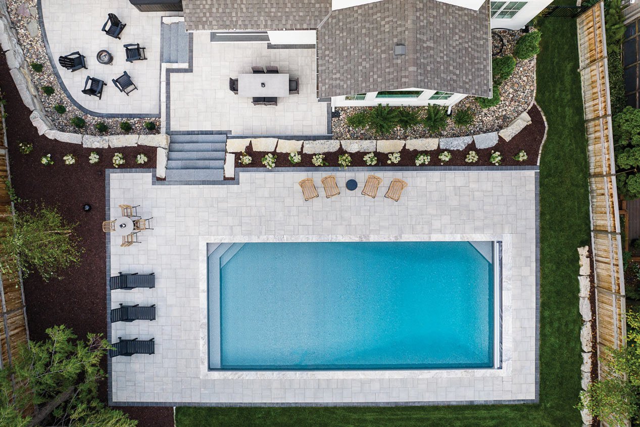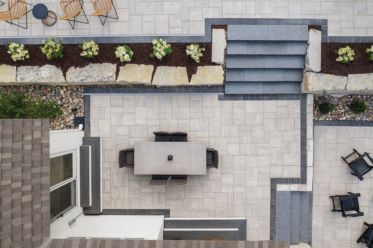 Using Grand Discover Pavers in color Allure, this three-tiered patio seating area, offers a captivating blend of functionality and aesthetics, providing the perfect backdrop for outdoor relaxation and entertainment.