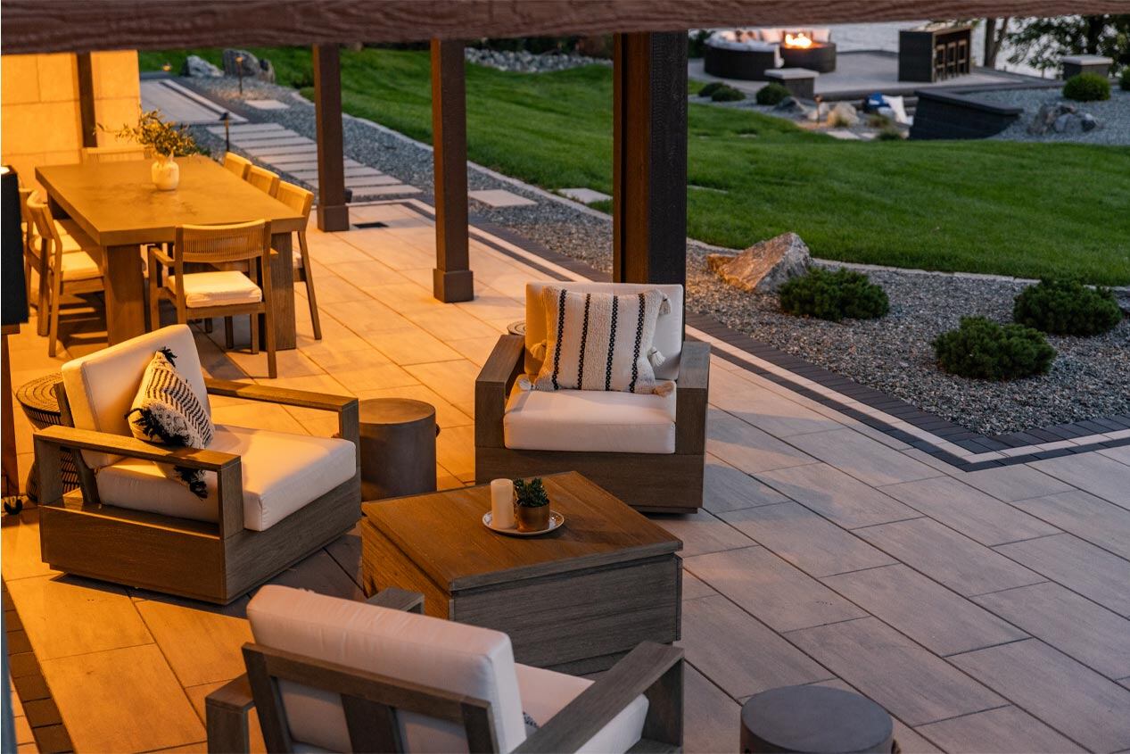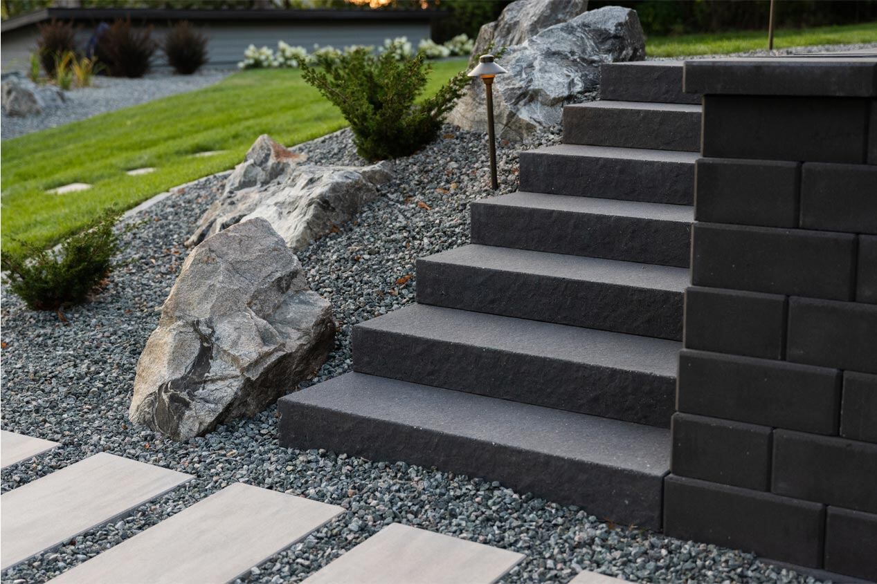 Concrete landscape products were chosen to create an expansive patio with a multi-level terrace built into the hillside. The design maximizes the functionality of the sloped terrain and provides dedicated areas for relaxation, dining, and outdoor entertainment.